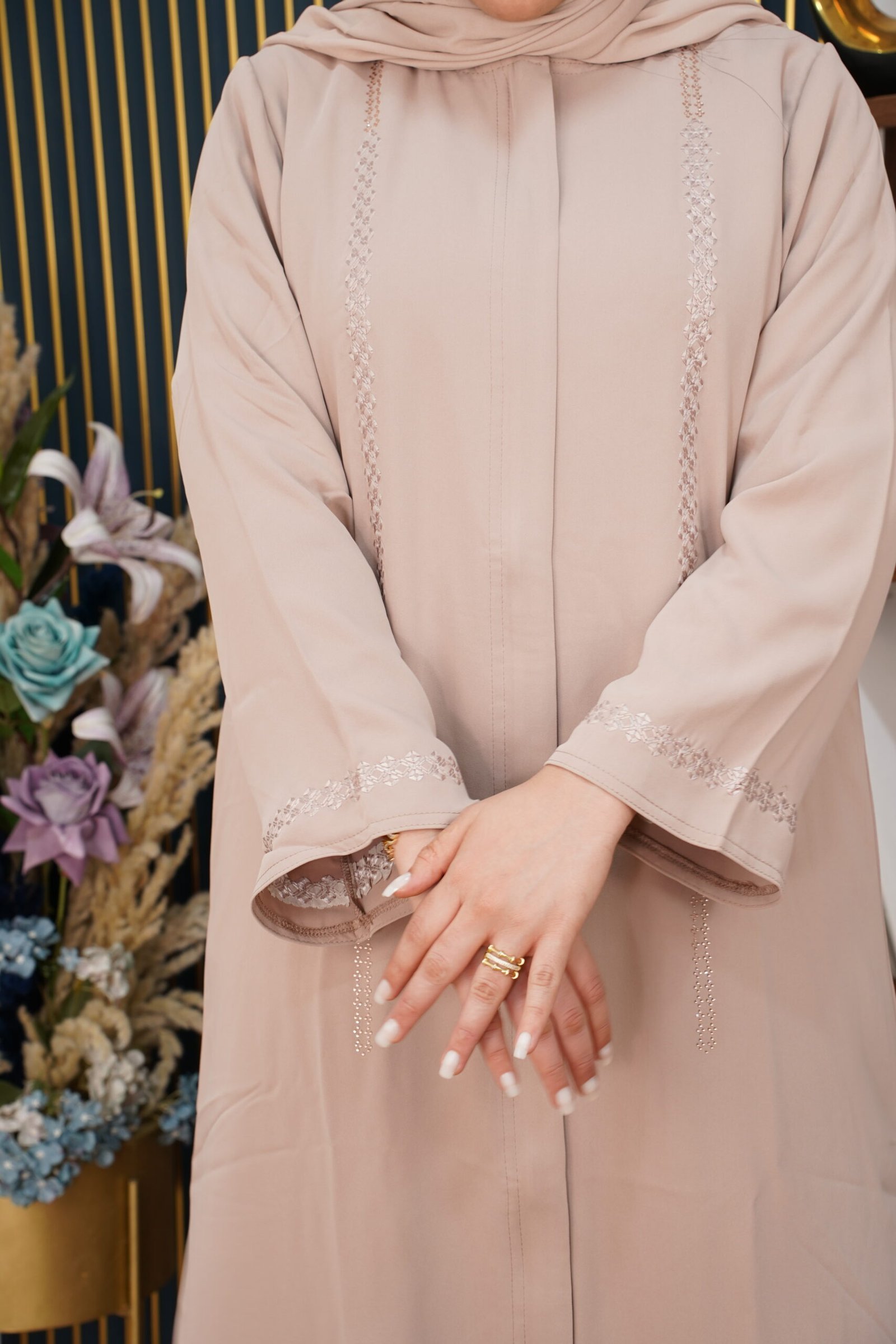 العباية كتجي بتفاصيل مطرزة بدقة على الأكمام والحاشية، كيزيدوها لمسة من الفخامة والرقي اللي كتعكس الذوق الرفيع.